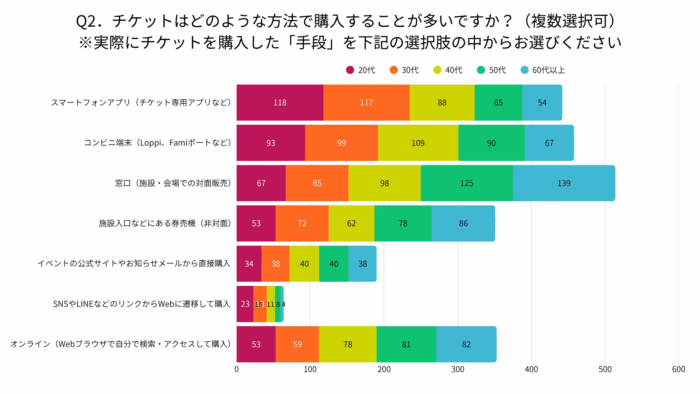 まず紹介するのは、チケットの購入手段に関するもの。アプリからの購入やコンビニ端末使用など、Web経由での予約や購入が多い一方で、一番多いのは窓口購入。特に60代以上で顕著、「対面で紙のチケット」という購入方法がまだまだ多い様子である。