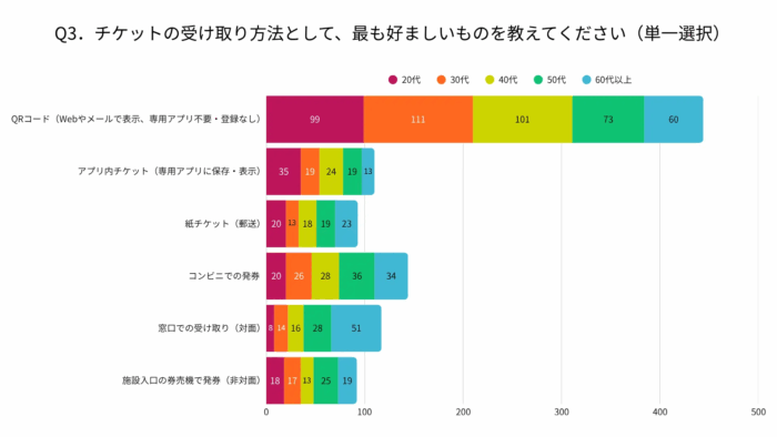 購入手段は多様化している一方で、チケットの受け取り方法として圧倒的に多いのが「QRコード」。このあたりはWebの利便性の恩恵に与りたい、そんな一面がよく表れていると思われる。