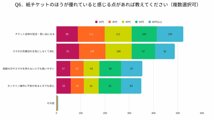圧倒的に支持されるWebサービスであるが、一方で紙のチケットへの評価も見てみたい。結果はこちら。紙のチケットの利点としては、チケットそのものが思い出になる、というのが一番多い。これは各世代同様に見られる傾向であることから、記念という側面を強調するのなら紙の使用という選択肢も大いにありそうだ。