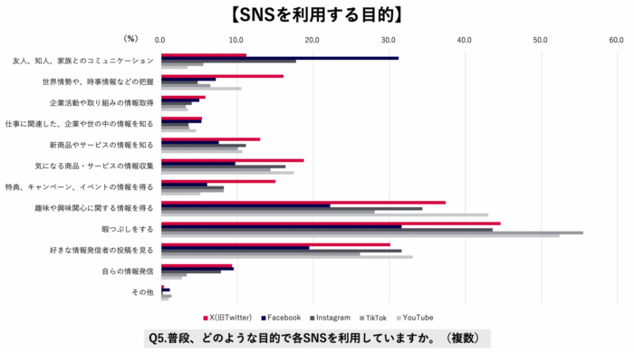 例えば、若年層が“気になる商品・サービスの情報収集”として活用しているのは、調査では X(旧Twitter)で18.8%、次いで YouTube が17.5%、とのこと。ここにビジュアル訴求に強い Instagram、短尺動画に強い TikTok など、端的な文言のみの投稿による即時性に強味のあるX(旧Twitter)など、各SNSの表現における特徴・強味を掛け合わせて考えると、おのずと答えが見えてくるはずだ。