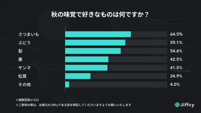 Jiffcyによる調査結果とは紹介の順番が異なるのだが、まずはZ世代の秋の味覚に対する意識から。なんと、彼らの調査対象のサンマは5位。1位はさつまいも、続いてぶどう、梨、栗と続く。今のZ世代においては「秋=スイーツ」というイメージなのだろうか??