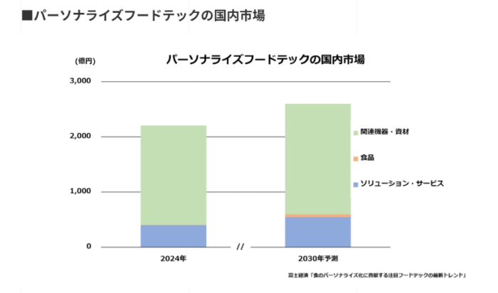 フードテックを活用した「食のパーソナライズ化」が進展している。背景には、単身世帯の増加や共働き、そしてリモートワークに伴うライフスタイルの変化、あるいは生活習慣病の増加などによる健康意識の高まりがあるとみられている。大手食品メーカーや家電機器メーカー、スタートアップなどの参入が活発化しており、多様化・細分化する消費者のニーズに合った食品や食体験が提供されることで2030年の市場は2024年比17.9%増の2,600億円が予想されている。