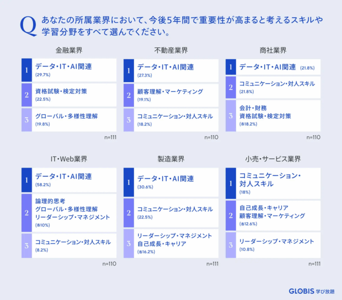 金融・不動産・製造など5業界の今後5年の重要スキル、トップは「データ・IT・AI関連」! GLOBIS 学び放題が発表(株式会社グロービス)
