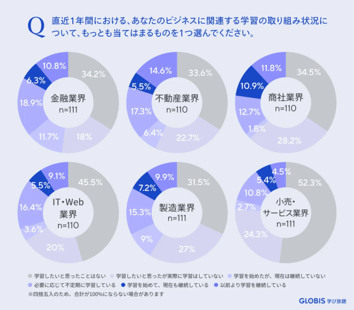 今回紹介するのは、株式会社グロービスが運営する定額制動画学習サービス内にて20代~50代のビジネスパーソンを対象に金融業界、不動産業界、商社業界、IT・Web業界、製造業界、小売・サービス業界における学習ニーズに関する実態調査を実施したもの。早速その内容を見てみよう。