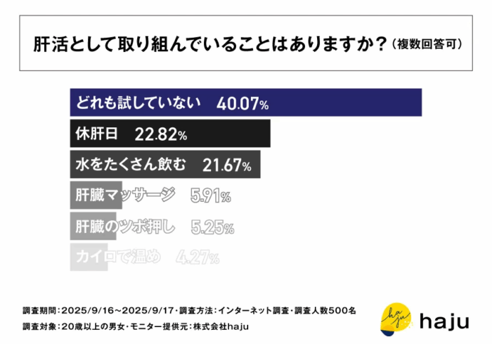 【調査リリース】腸活より知られていない「肝活」—認知率は半分以下。ダイエットとの関係は“誤解”も多数?!(全国500人調査)(株式会社haju)