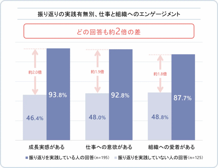 出典:株式会社コードタクト “【調査レポート】定期的な振り返りを行う人は、成長実感・仕事への意欲・組織への愛着が約2倍に”