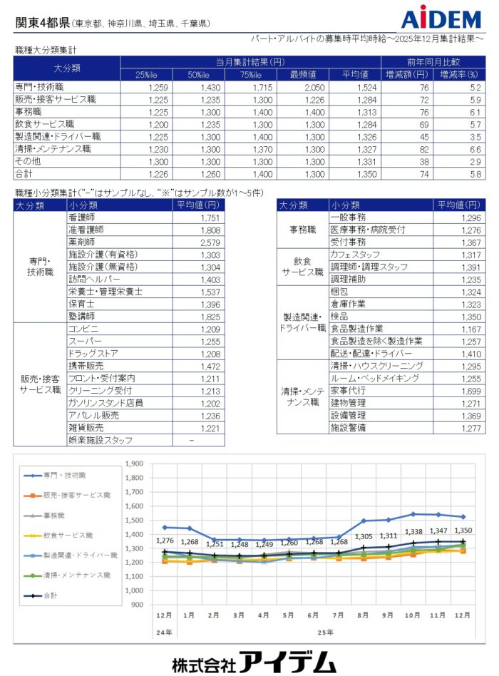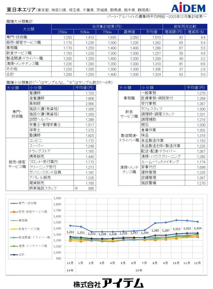総合人材情報サービスの株式会社アイデムが、求人メディア『イーアイデム』や採用ホームページ構築サービス『Jobギア採促』において公表された求人情報から2025年12月のパート&アルバイト募集時平均時給を集計した。その結果を紹介しよう。