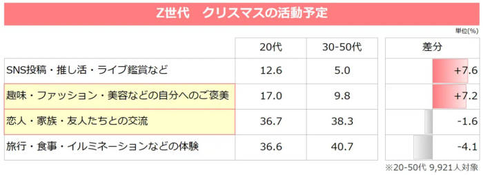 次にクリスマスの活動予定について。こちらも先の結果と同様に、恋人との交流が数字上は多いものの、SNSや推し活、自分へのご褒美といった予定が上の世代と比して多くなっている。