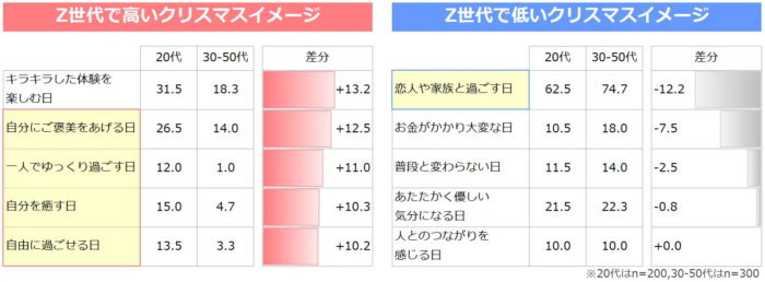 最後は、先の二つを裏付ける調査結果。Z世代のクリスマスへのイメージ調査の結果であるが、「恋人や家族と過ごす」という割合が上の世代に比べて低く、「代わりに自分へのご褒美の日」という捉え方が強くなっている。そんな傾向が見て取れる。