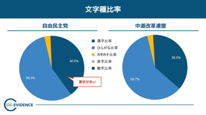 まず、話し言葉の区切り方(文の長さ)について比較した結果、自民党は平均41.5字の“短文・凝縮”型の話し方をするのに対し、中道改革連盟は平均51.3字と長めの文を用いる“丁寧・説明重視”型の傾向が確認された。この違いは、情報を短く区切って畳みかけるか、一つひとつ丁寧に説明するかという話法の対照を鮮明にしている。さらに、自民党は漢字使用比率が高く、文節構造が凝縮傾向にある点が示された。