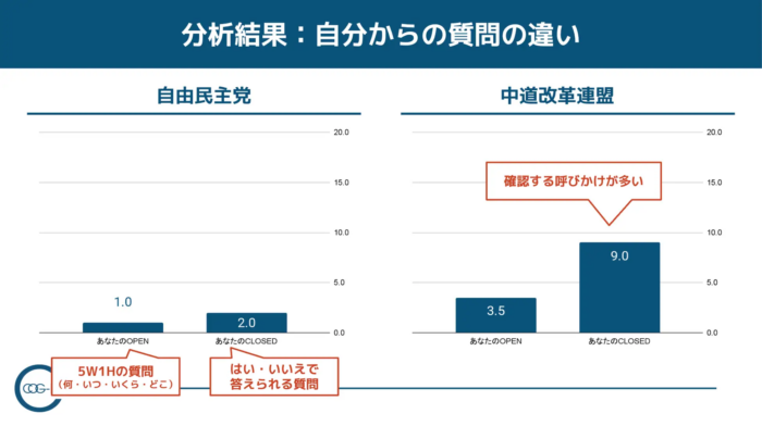 次に、呼びかけ方の違いについて。中道改革連盟は演説や発言の中で“確認質問(Yes/No型)”の呼びかけが多数検出され、問いかけを伴いながら進めるコミュニケーションが特徴。比較的長めの問いかけとそれに続く回答・自問自答を含むスタイルが多く見られ、聞き手の反応を促す“対話型・丁寧・呼びかけ重視”の構造であることが明らかになった。一方、自民党のアプローチは、それに比べると問いかけや確認質問の比率が低い構造となっている様子であった。