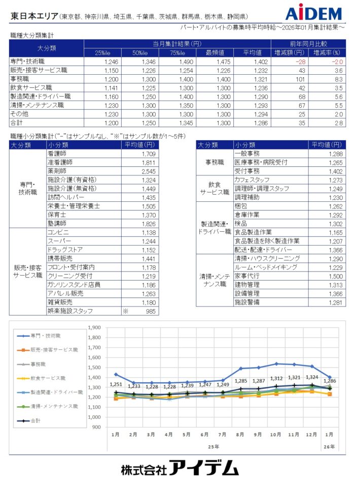 総合人材情報サービスの株式会社アイデムが、求人メディア『イーアイデム』や採用ホームページ構築サービス『Jobギア採促』において公表された求人情報から2025年12月のパート&アルバイト募集時平均時給を集計した。その結果を紹介しよう。