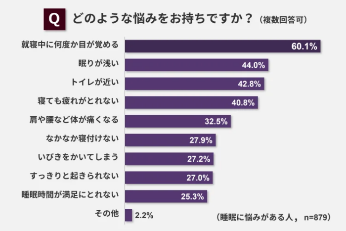 また悩みの内容を見ると、「就寝中に何度か目が覚める」が60.1%、「眠りが浅い」が44.0%、「トイレが近い」が42.8%と、単なる睡眠時間不足だけでなく、眠りの質そのものに問題を感じている層が多いことがうかがえる。このあたり、心当たりのある方も多いのではないか。
