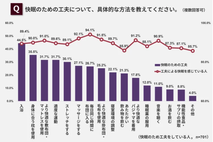 こうした状況を受け、睡眠改善のために何らかの工夫をしている人は53.4%と、半数以上が対策に取り組んでいる様子。具体的な工夫としては、「入浴」が44.5%と最も多く、次いで「身体に合う枕の使用」(35.5%)、「適度な運動」(31.7%)。これらの工夫を実践している人の多くが「快眠を得られている」と回答しており、生活習慣や環境を整えることが睡眠の質向上に直結していることが数値からも裏付けられているようだ。