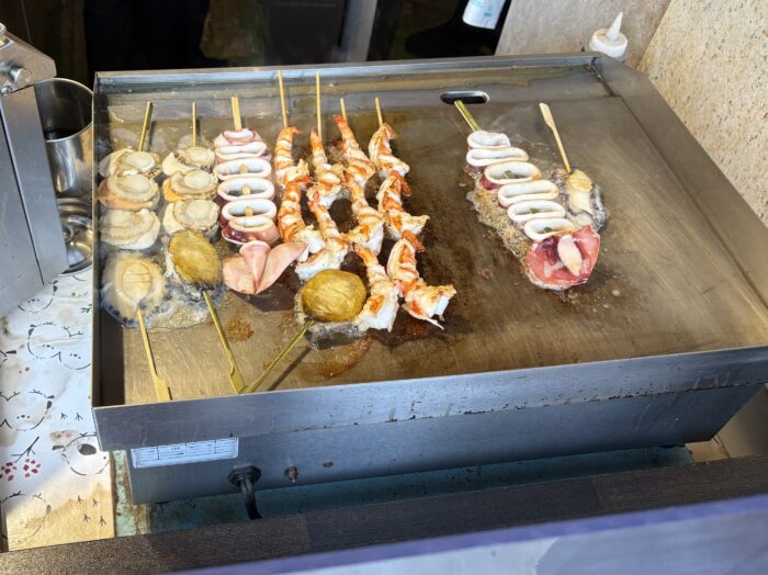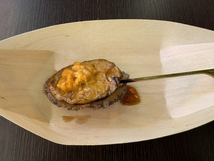 伊豆の名物でもある「金目鯛」がウリということもあり、「てんこ盛り魚屋のまかない丼定食」を注文。定食を待ちながら、ウニをトッピングした「あわび串」を食べた。こちらも名物と謳っているだけに美味しい。コリコリとした食感のあと、口の中に「海」が広がる。