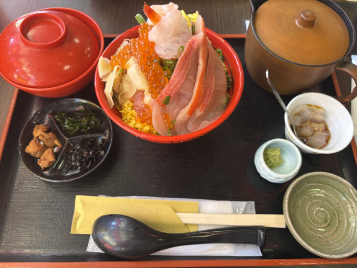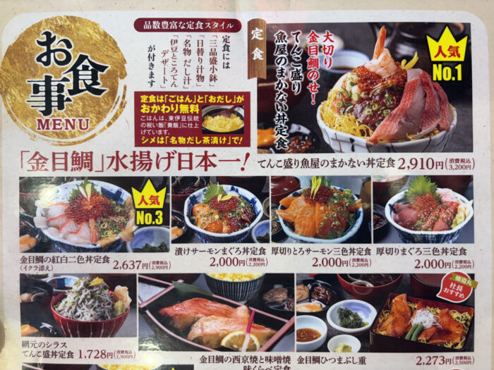 定食は金目鯛、いくら、ほたてとオールスターが勢ぞろい。特に金目鯛は脂が乗っていて美味しい。ご飯は酢飯ではなく、「黄飯」。サフランライスのような見た目だが、くちなしの実で色付けし、東伊豆地方ではお祝いの際に食べられるという。ご飯はお代わり自由というのもうれしい。